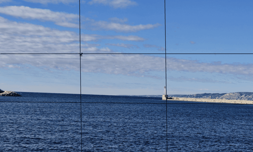 Dans la deuxième, la ligne de séparation mer ciel est sur la ligne du bas, le phare et l’oiseau sont sur des points focaux.