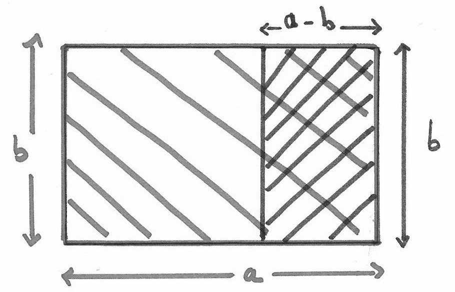 La particularité d’un rectangle d’or, est que si on trace à l’intérieur un carré de côté la largeur du rectangle, le petit rectangle qui apparaît est exactement un rectangle d’or. C’est même comme cela qu’on définit le nombre d’or. Autrement dit, b/(a-b)=a/b.