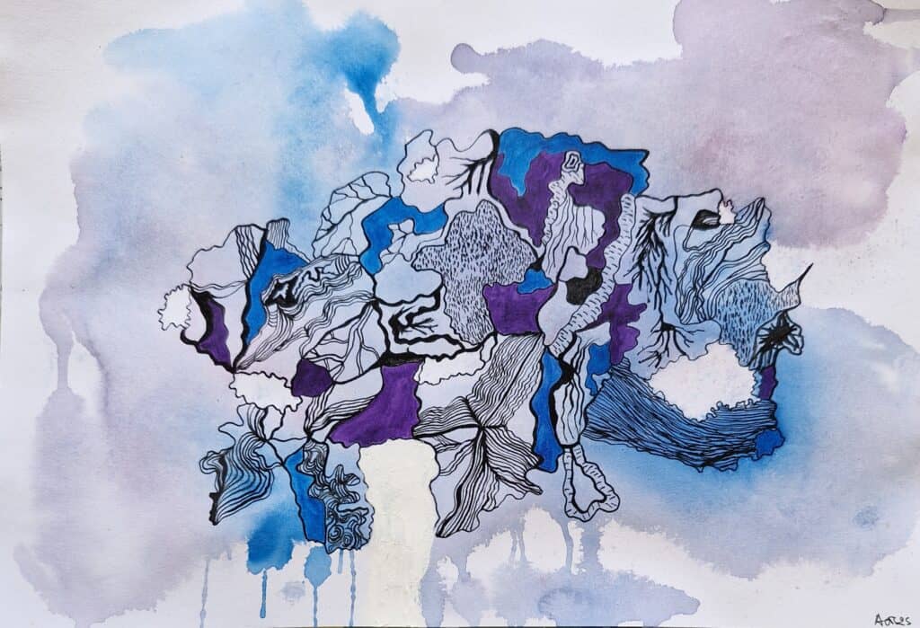 De nouvelles terres inconnues. Publié le 11/02/2025 Fond aquarelle, plume et encre de chine. Format A4. Glace Un poisson veille