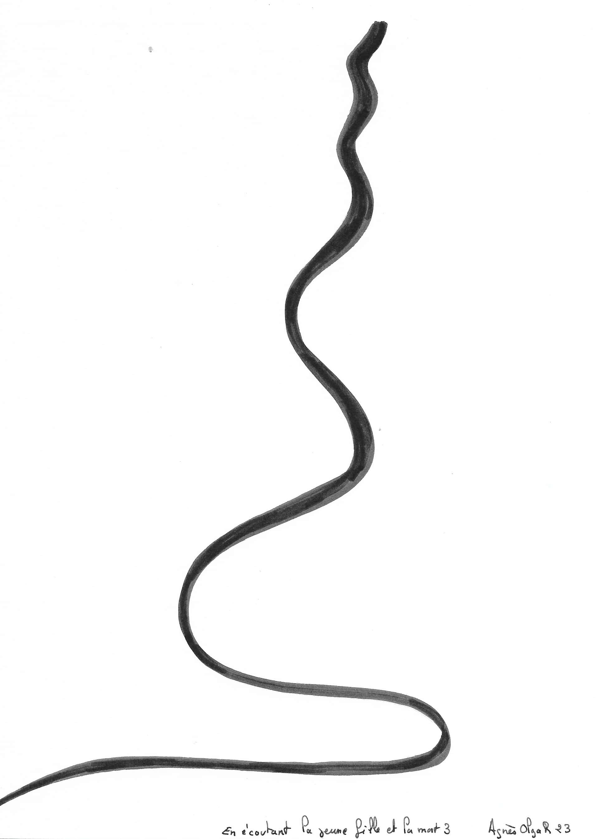 J’ai réalisé ces dessins un soir, en écoutant La jeune fille et la Mort, de Franz Schubert. J’ai dessiné de façon frénétique, essayant d’accompagner la musique avec mon geste. Puis, j’ai recherché la ligne « pure ». J’ai joué avec l’équivalent du silence en dessin, le vide. Je cherchais LE geste. Cela m’a permis de comprendre ces artistes qui exposent des peintures minimales, avec un seul trait. J’avais l’impression qu’ils se moquaient du monde. Et puis j’ai pu imaginer que leur trait avait du sens. En tout cas, les miens en ont, pour moi. J’espère qu’ils en auront aussi pour vous.
