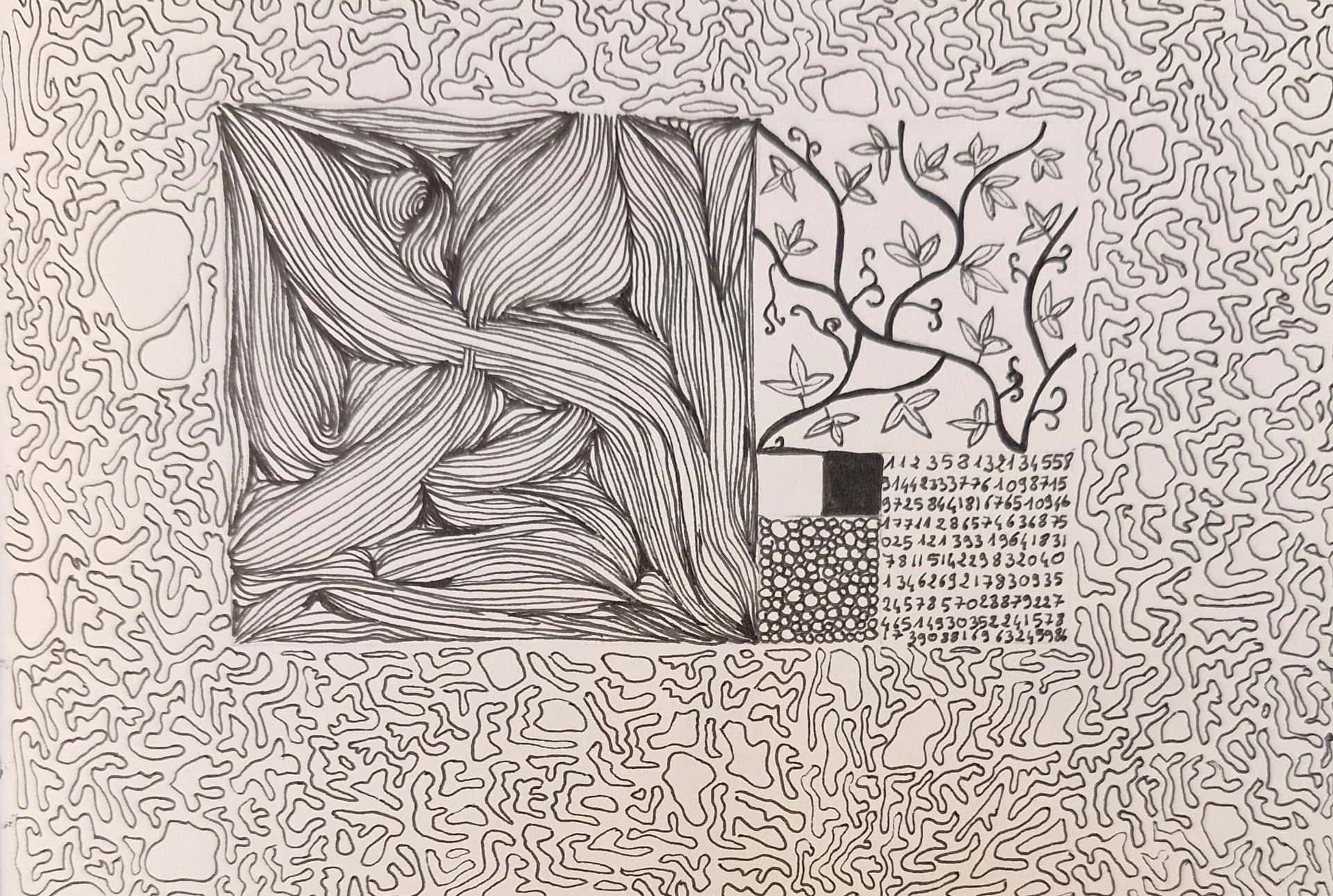 Dans mes dessins, je joue avec cette construction formelle et des éléments vivants, végétaux ou organiques. Les dessins qui suivent sont des petits formats de A5 à A4. Les techniques sont variées et mixtes le plus souvent. Aquarelle, feutre, crayon.